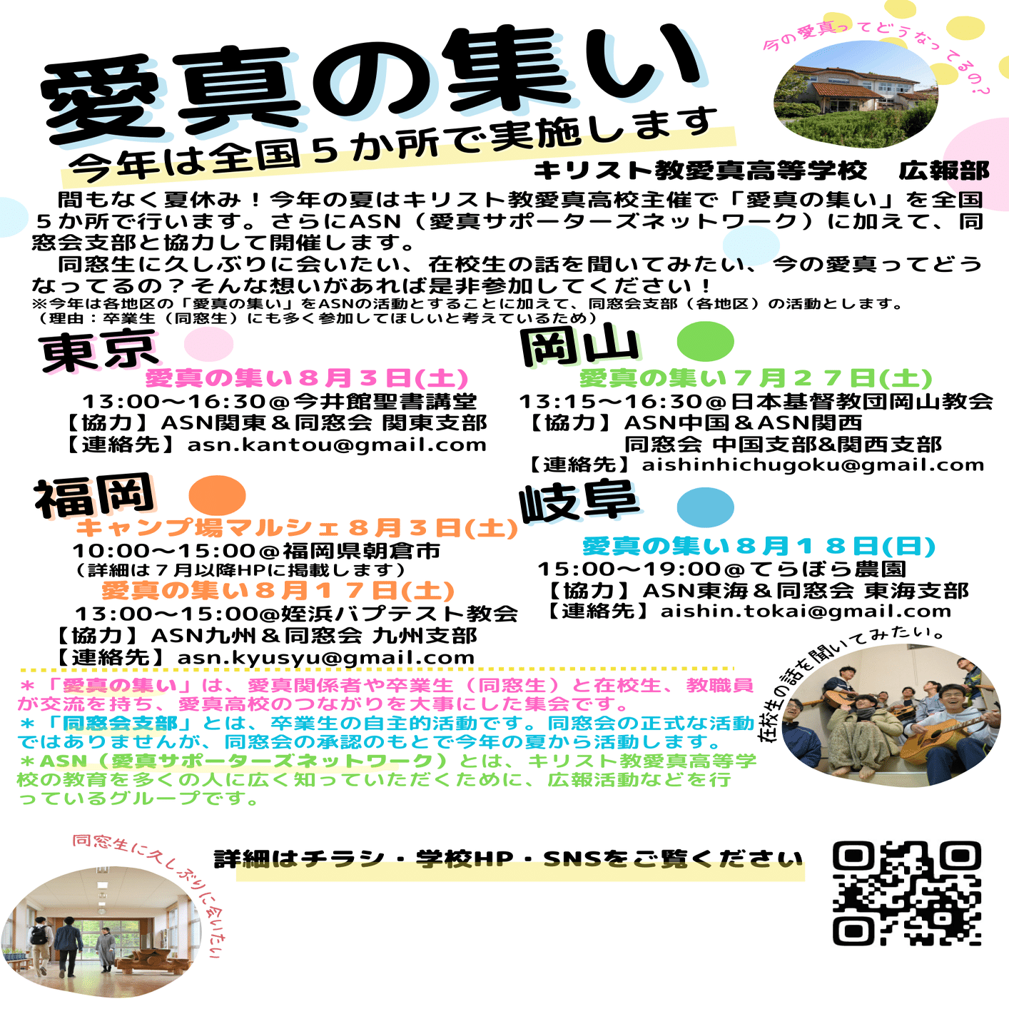 間もなく夏休み!今年の夏はキリスト教愛真高校主催で「愛真の集い」を全国5か所で行います。さらにASN(愛真サポーターズネットワーク)に加えて、同窓会支部と協力して開催します。